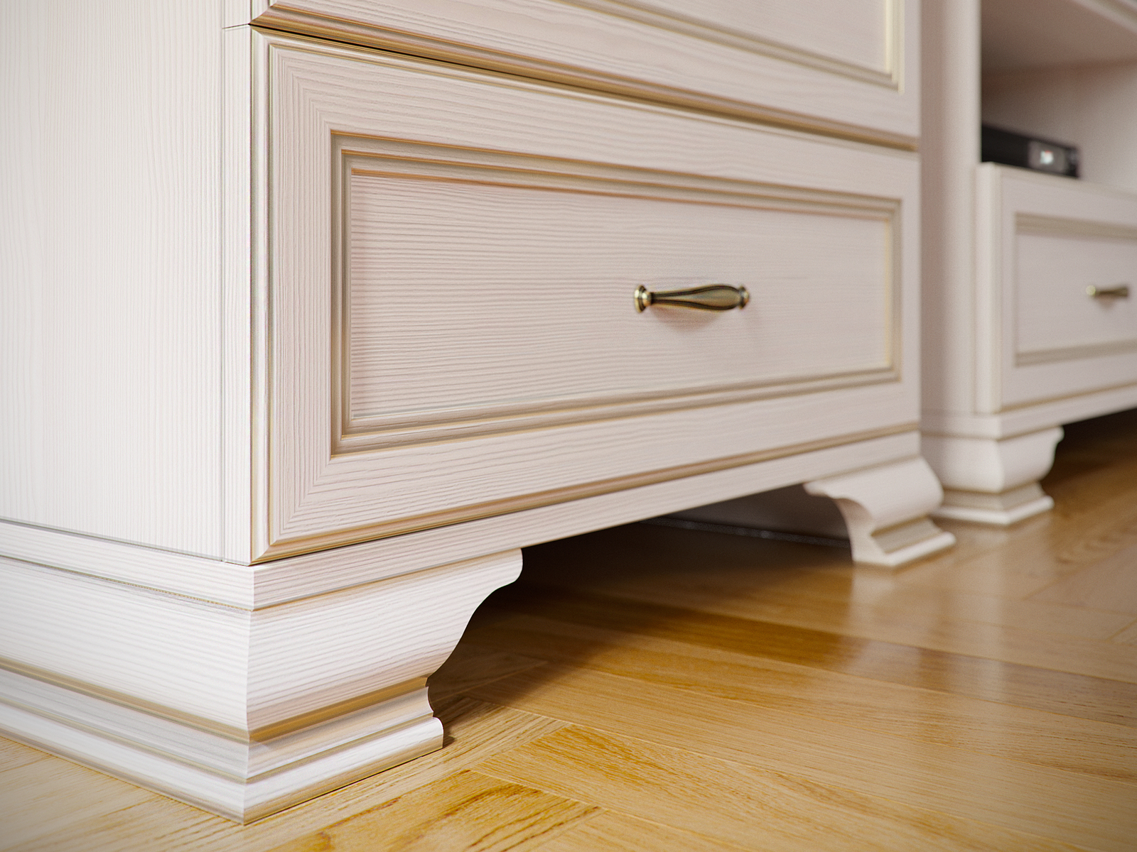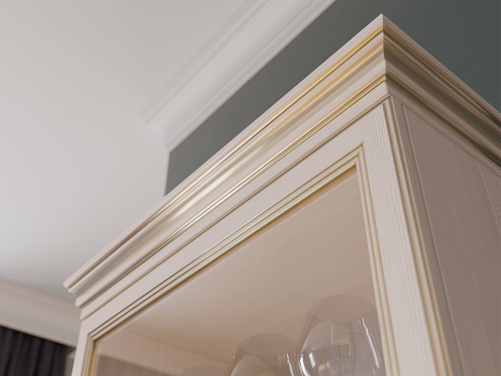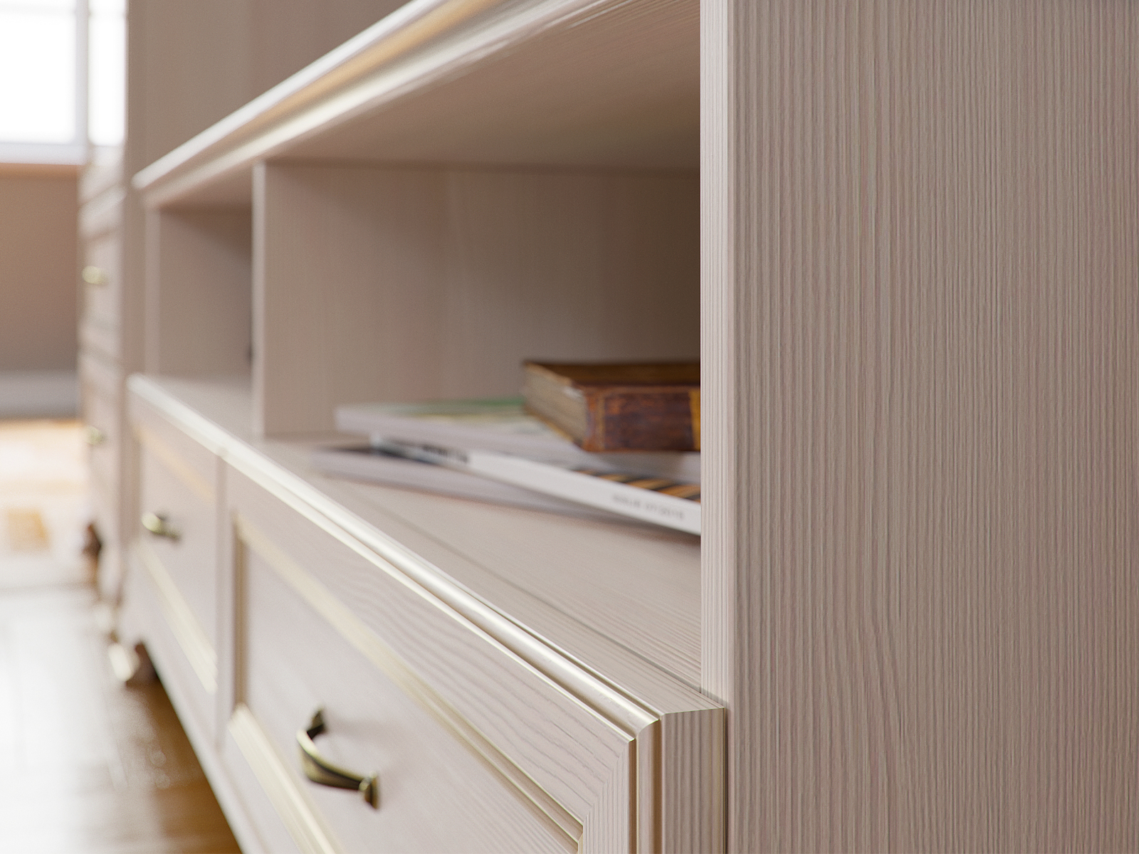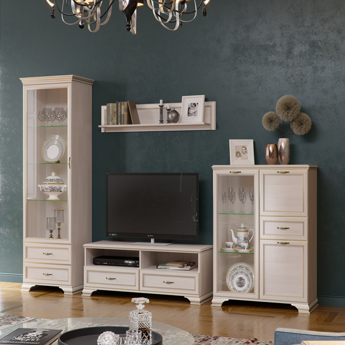 Образ классической гостиной представлен сочетании темных стен и мебели в нежном бежевом цвете. Насыщенный серо-синий оттенок служит контрастным фоном для яркой и эффектной мебели для гостиной Сиена. А коричневый пол гармонирует с оттенками лицевой фурнитуры и патины.